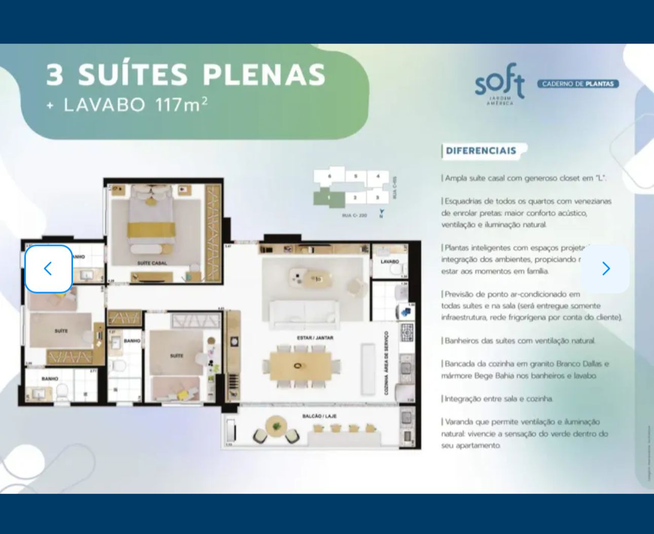 Apartamento com 3 Quartos e 4 banheiros à Venda, 117 m² por R$ 990.000 Apartamento com 3 suítes plenas a venda Residencial Soft Jardim América Imóvel é composto por ampla sala integrada com cozinha, varanda, lavabo, 3 quartos sendo todas tipo suíte; Diferenciais: Ampla suíte casal com generoso closet em “L”. Esquadrias de todos os quartos com venezianas de enrolar pretas: maior conforto acústico, ventilação e iluminação natural. Plantas inteligentes com espaços projetados para integração dos ambientes, propiciando mais bem-estar aos momentos em família. Previsão de ponto ar-condicionado em todas suítes e na sala (será entregue somente infraestrutura, rede frigorígena por conta do cliente). Banheiros das suítes com ventilação natural. Bancada da cozinha em granito Branco Dallas e mármore Bege Bahia nos banheiros e lavabo. Área privativa 117 m² 2 vagas de garagem Previsão de entrega: Junho 2026 --- Venda em parceria com a Sharks Imobiliária.